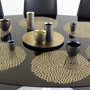 隣の人と肘やマットがぶつかるストレスが消えるだけでなく、円の中に円がある幾何学的な美しさが、いつもの食事を「レストランの一皿」のように格上げしてくれます。